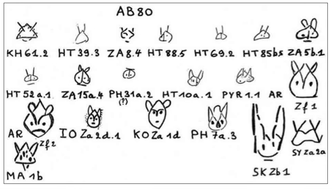 Figure 3 AB80 attestations: Iconic survivors vs. abstract notation? Variants range from recognizable animal imagery (cat/rabbit heads with directional facing and asymmetry, likely inherited from Cretan Hieroglyphic feline signs) to non-pictorial geometric forms (shared strokes but no resemblance). If iconic and abstract renderings serve different functions, one perceptual/representational, the other relational/spatial, the unified sign identity in GORILA and SigLA may mask an original categorical complexity. Hand-drawn compilation after paleographic data in Godart & Olivier (1976-1985, GORILA V) and SigLA (Salgarella & Castellan 2020-present), including examples from HT, ZA, PH, IO, PYR, and others.
