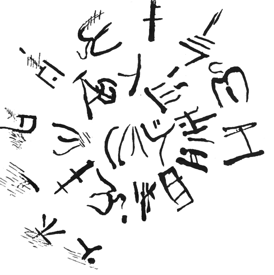 Figure 4. Ink-written Linear A inscription on the interior surface of a cup, Knossos. After Evans (1909). Note the radial arrangement of sign clusters around a central axis and the spiral alignment adapted to the cyclic surface.