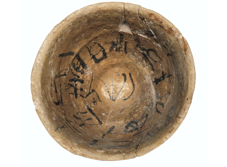 Figure 1a. Interior of KN Zc 6 (HM 2630), clay drinking cup with Linear A inscription in sepia ink, Knossos, ca. 1700 BCE. Diameter 8.4 cm. Photograph courtesy of Heraklion Archaeological Museum / Things That Talk.
