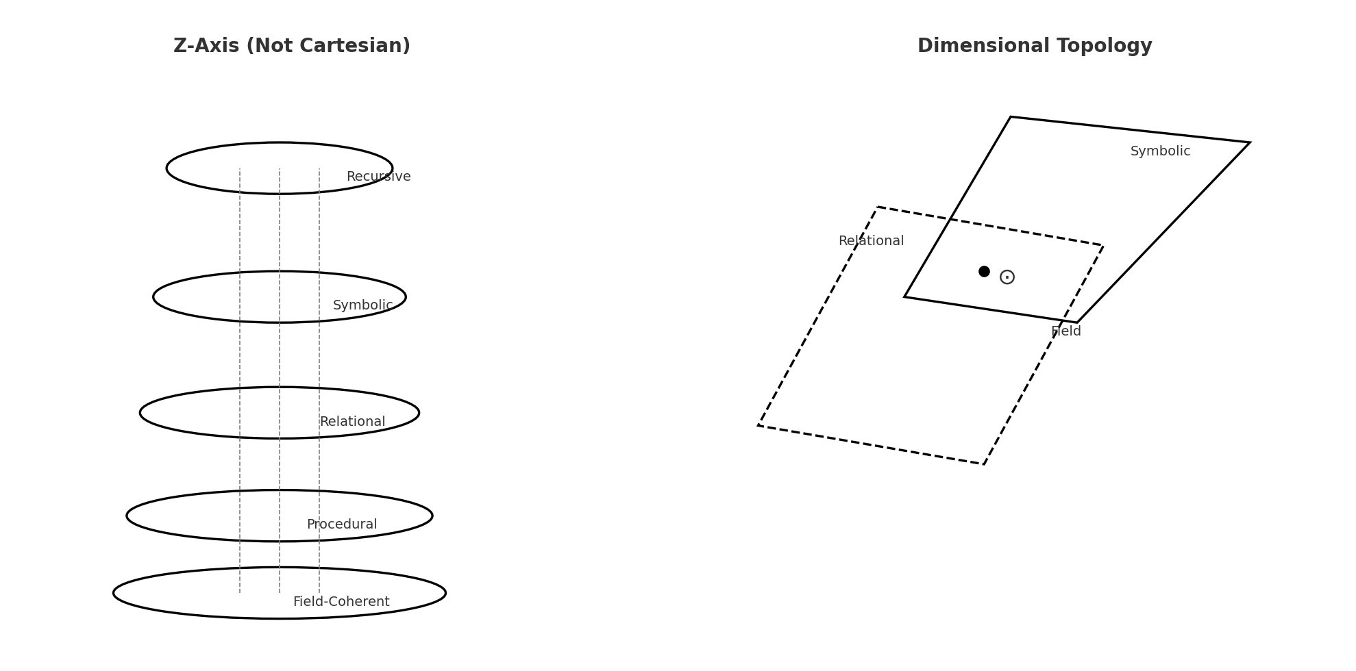 - A non-linear vertical stack showing resonance layers: Field-Coherent → Procedural → Relational → Symbolic → Recursive
