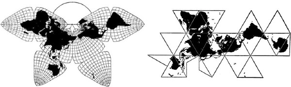 Buckminster Fuller’s Dymaxion map, patented in 1943 and refined through 1954, unfolded the globe into an icosahedral sheet, prioritizing relational proximity over Mercator’s distortions. Fuller’s “spaceship Earth” ethos saw the planet as a unified system, its continents interwoven without arbitrary splits. Yet, cartographic scholar Gene Keyes (2007), critiques its “seven deadly flaws”: asymmetry in layout, a fractured graticule across 22 disparate facets, warped meridians and poles, poor scalability exposing messiness, non-metric triangle edges (7,048.89 km vs. Cahill’s 10,000 km), weak globe correspondence, and reduced learnability compared to the symmetrical Cahill-Keyes octahedral map.